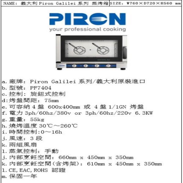 品名:全新義大利進口機械式蒸烤箱PIRON旋風烤箱PF7404 /唯一10萬以下蒸烤箱/餐飲設備/營業用